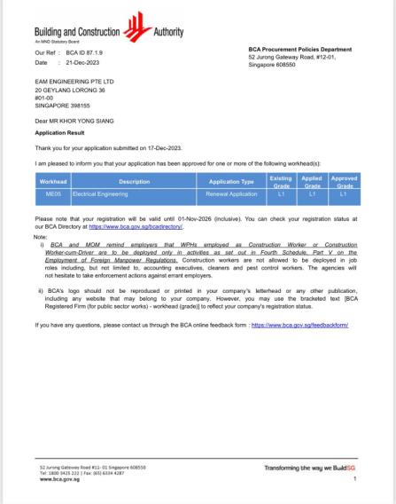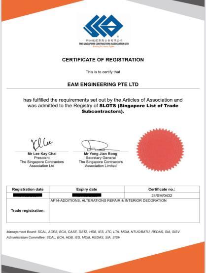 - Member of SECAL (Singapore Electrical Contractors & Licensed Electrical Workers Association)